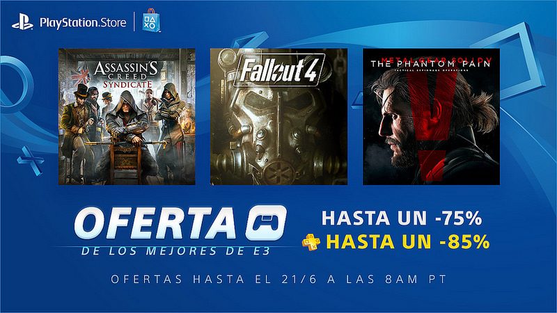 ¡Hola a todos! E3 empieza hoy y estamos celebrando toda la semana con un descuento de hasta 75% en algunos de los títulos más grandes de la historia del evento. A partir de ahora, llévate Assassin’s Creed: Syndicate, Metal Gear Solid V: The Phantom Pain, y Fallout 4 en oferta. Además, los miembros de PlayStation Plus tendrán descuentos de hasta el 85%.