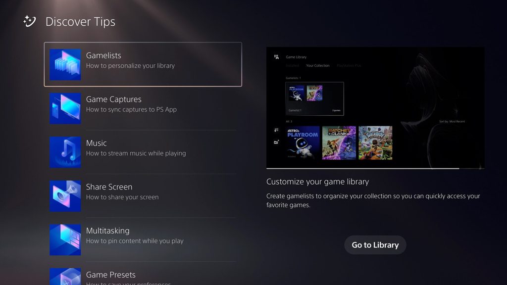 - Descubre nuevas funciones. Busca consejos útiles para aprovechar al máximo tu PS5 y conoce las nuevas funciones en la nueva sección Descubrir consejos.