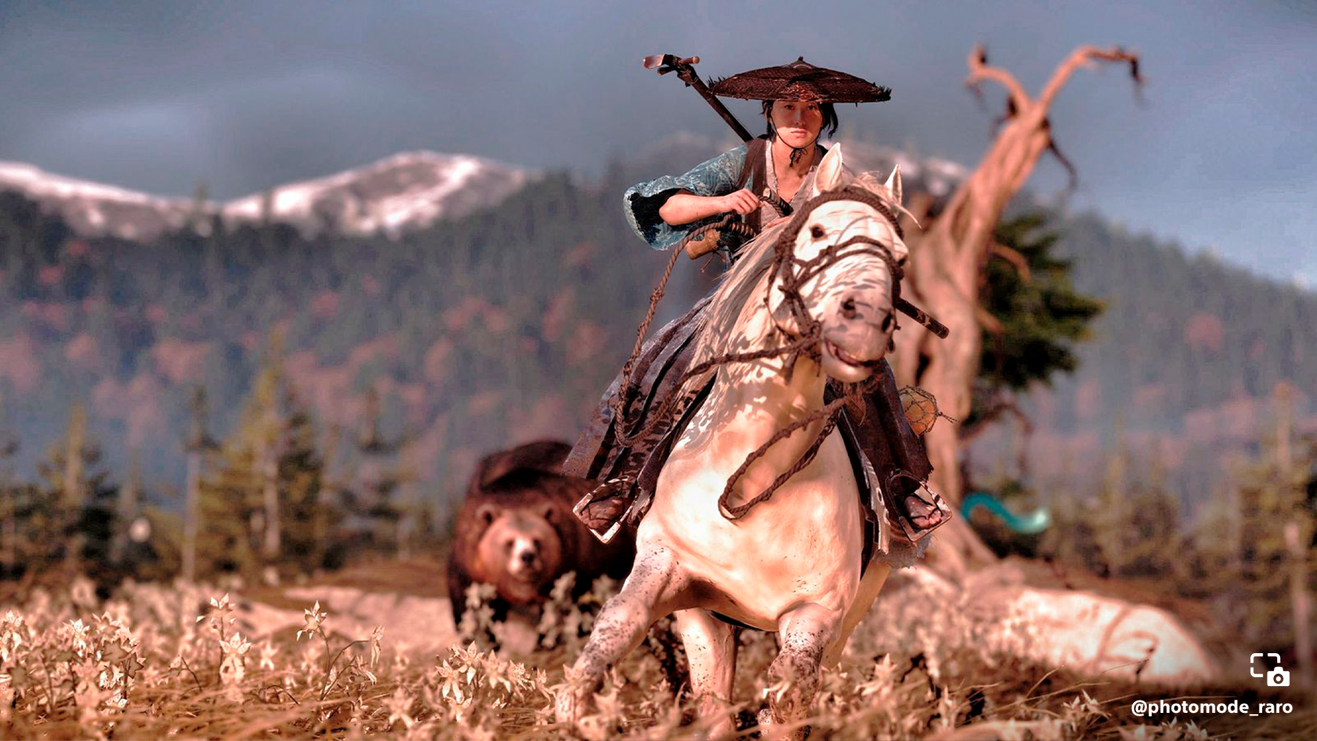 Atsu huye de un peligroso oso a toda velocidad sobre su fiel caballo. Creación enviada por @photomode_raro.